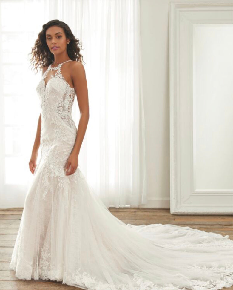 Adrianna Papell Platinum 31226 trumpet silhouette bridal gown is styled in tulle over lace, with an illusion halter neckline and beaded spaghetti straps. Beaded lace appliques richly embellish this romantic wedding dress, complemented with semi-sheer sides and covered buttons on the illusion back. The scalloped lace hem spills to a chapel train.