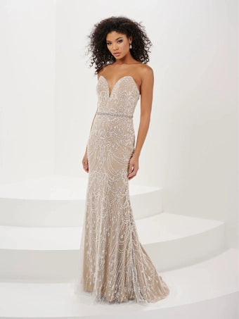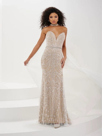 The strapless sweetheart gown features a stunning bead pattern in crystal and pearl. The choker with a chiffon float is removable.