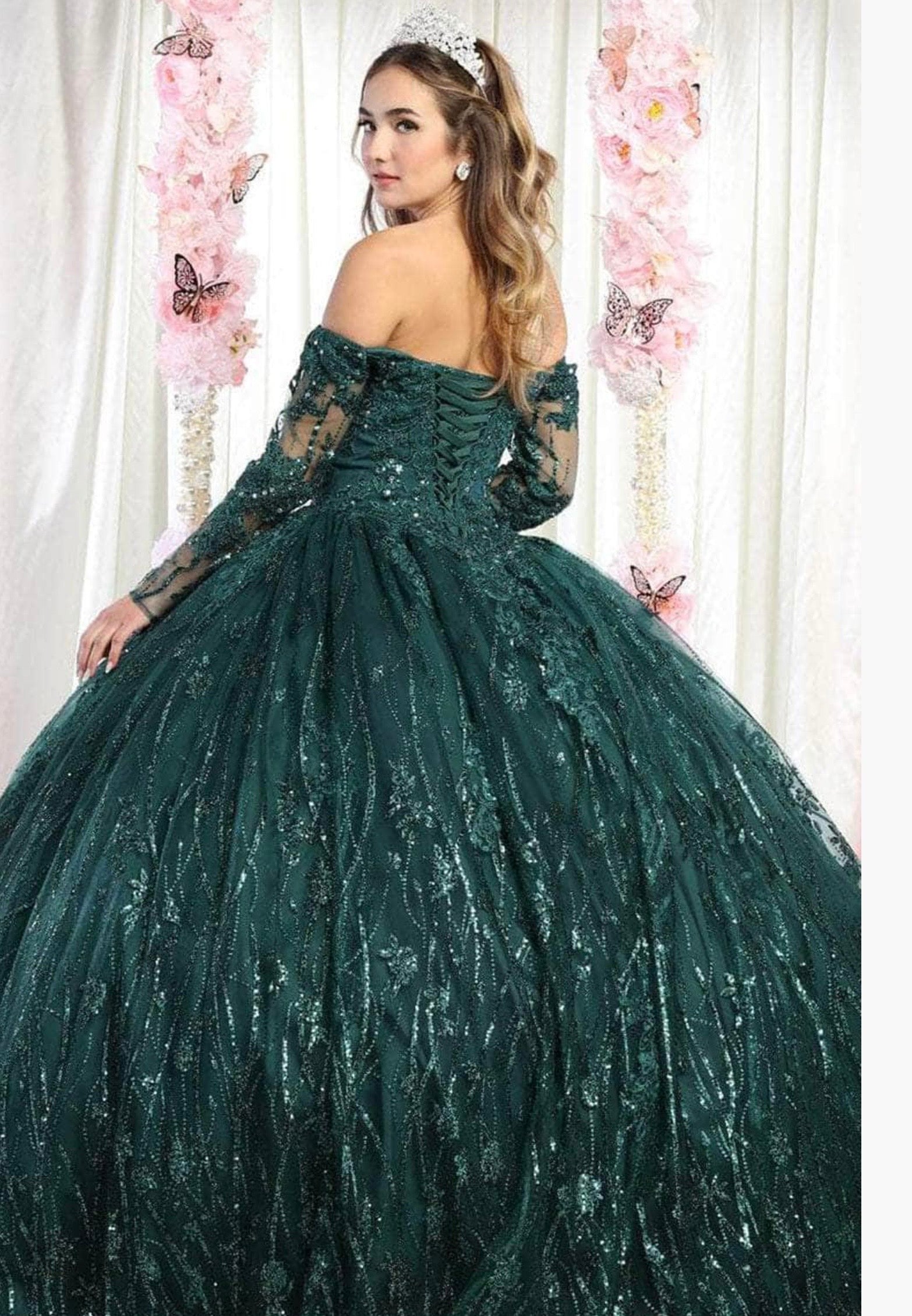 This glamorous, full length ball gown featuring all over sequins, intricate lace and speckled beading. Designed for Quinceanera or formal events it features an off-the-shoulder sweetheart neckline. Sheer long sleeves and a corset-style lace-up back.