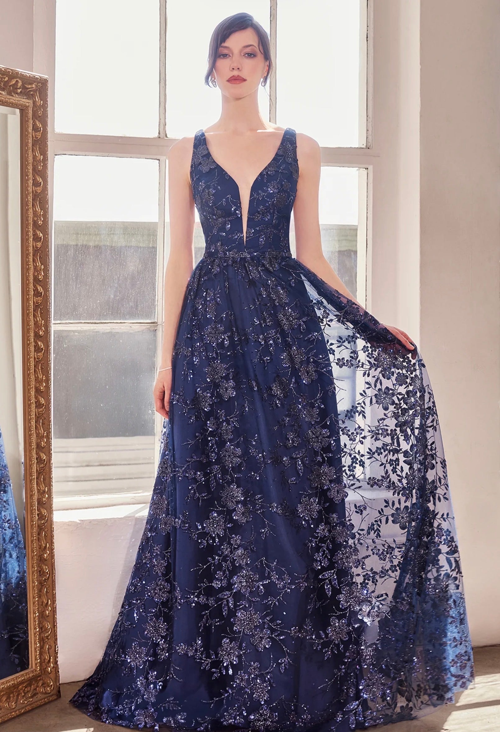 Embodying timeless elegance, this A-line gown features a deep V neckline with illusion mesh insert and floral glitter appliqué that cascades down the entire silhouette. The sleeveless bodice is structured and supportive, while the glitter-embroidered overlay catches the light with every movement. A floor-length skirt and hidden zipper closure in back make this gown as comfortable as it is enchanting—perfect for mothers of the bride, formal events, or garden weddings.